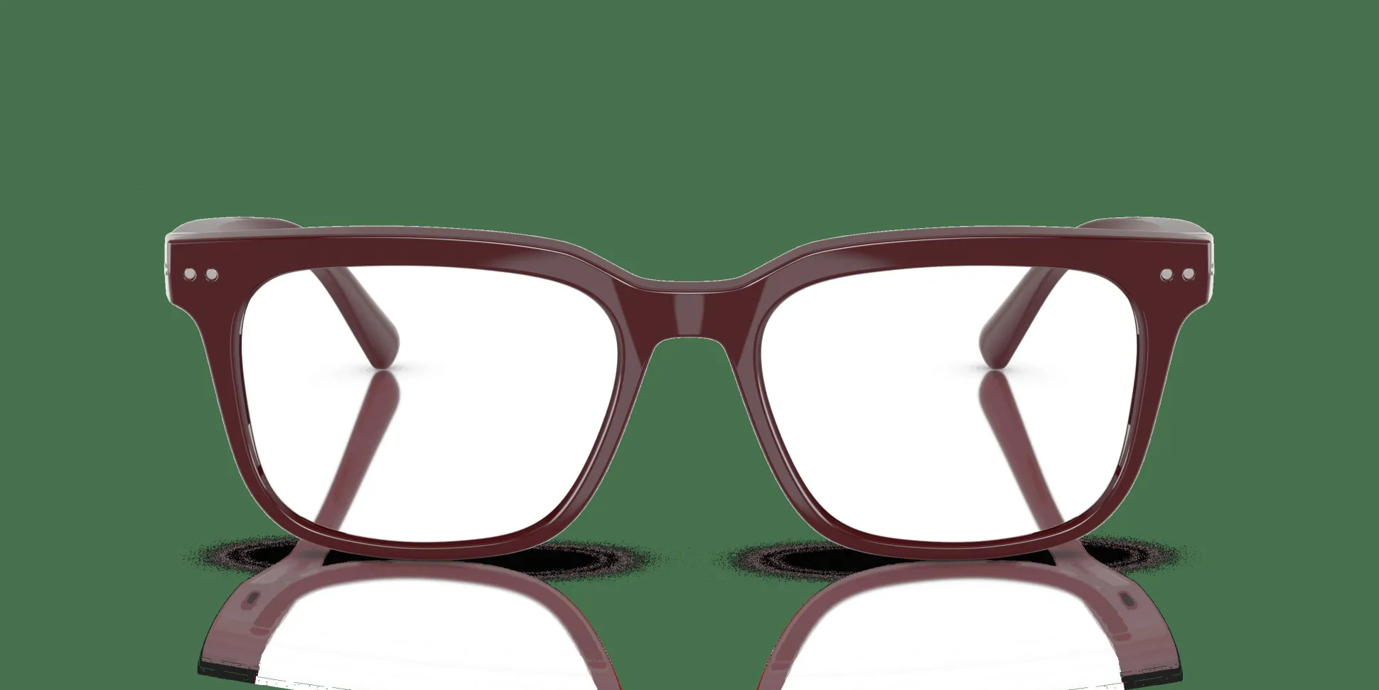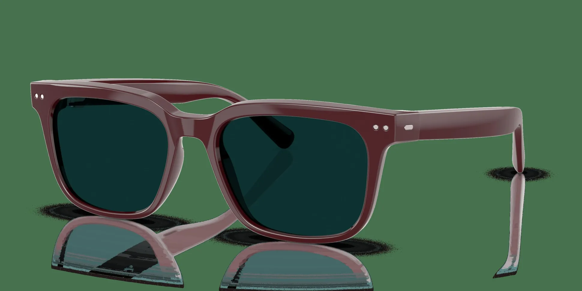 Monture carrée moderne et élégante en rouge bordeaux avec des verres Transitions, non correcteurs, couleur Émeraude.