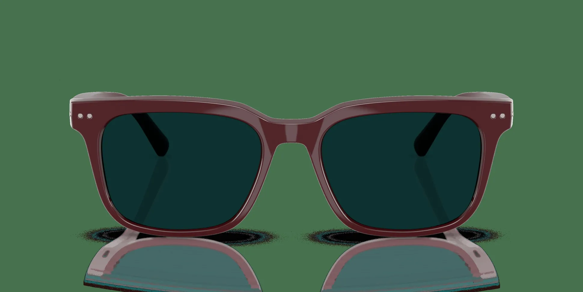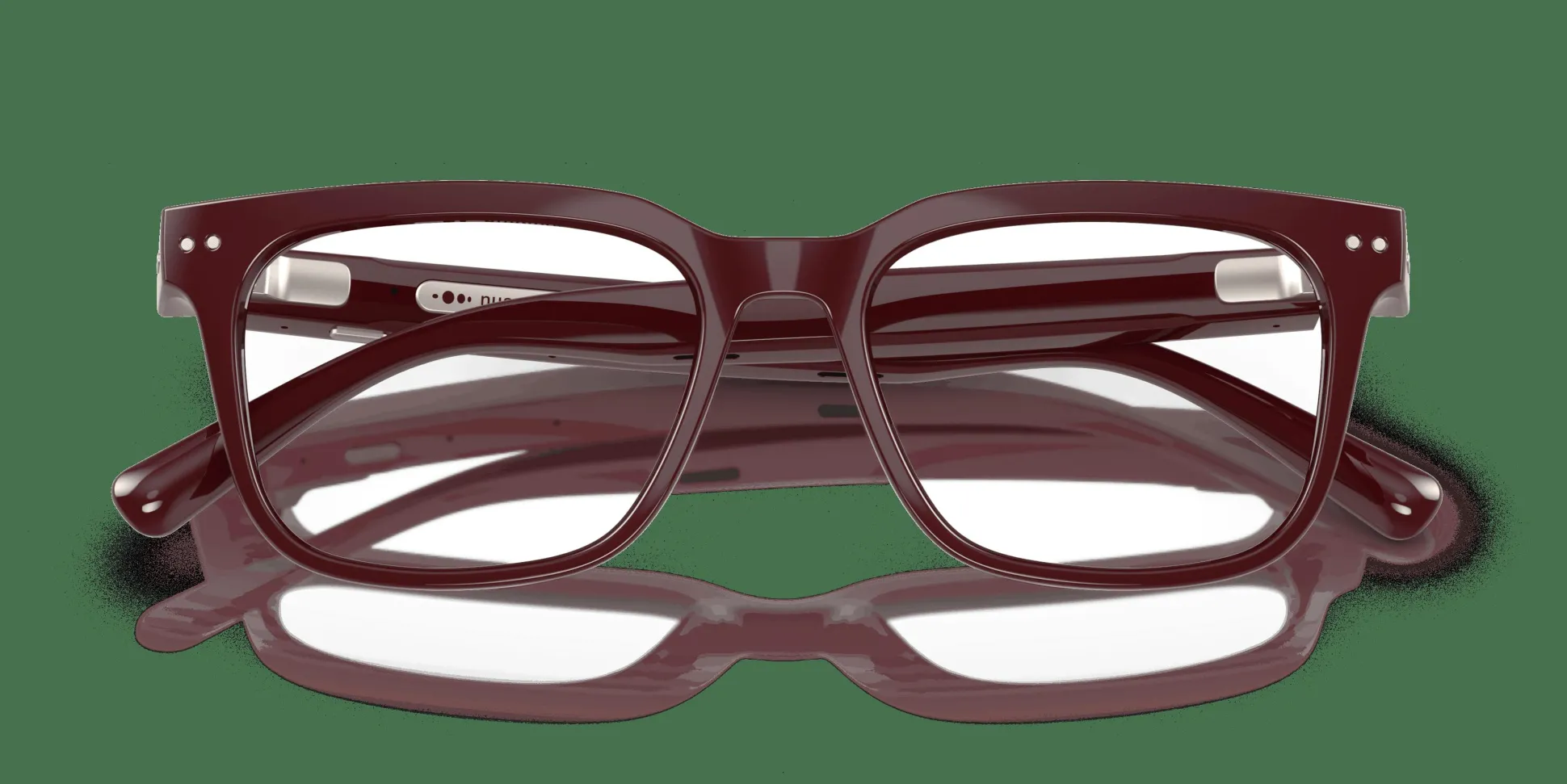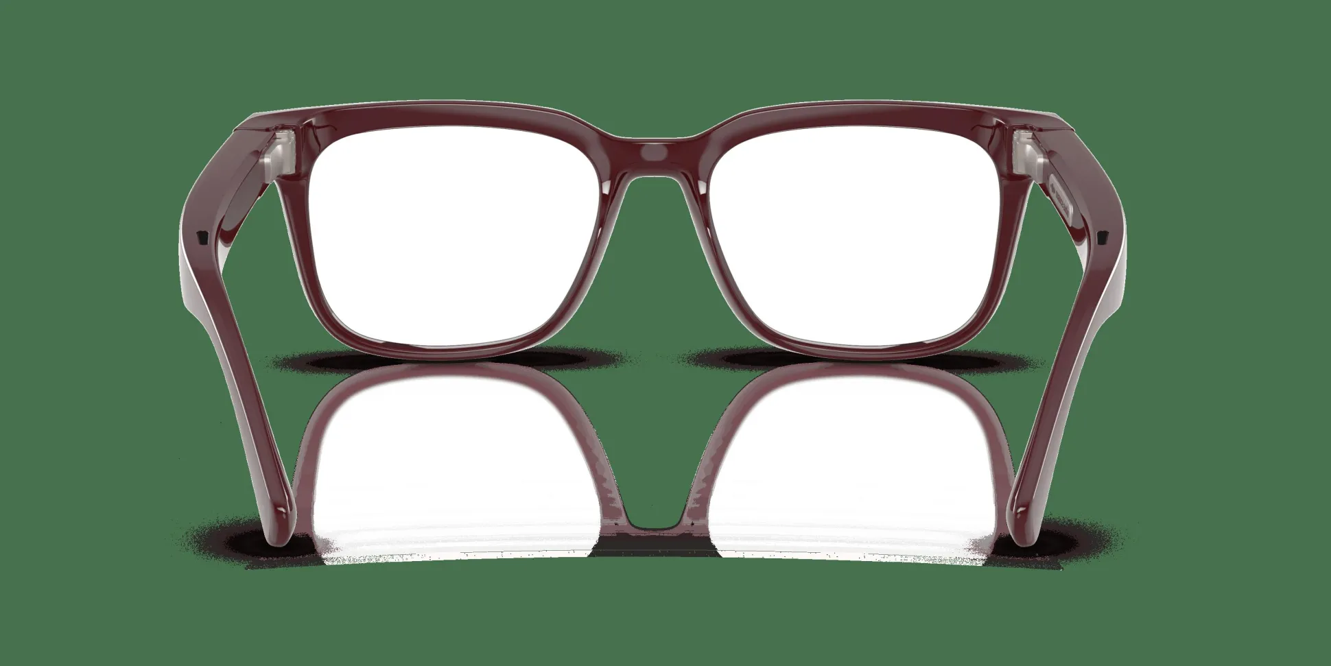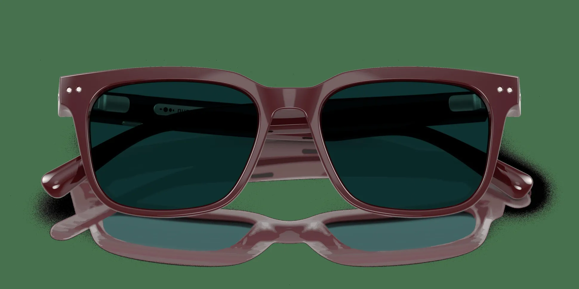 Monture carrée moderne et élégante en rouge bordeaux avec des verres Transitions, non correcteurs, couleur Émeraude.